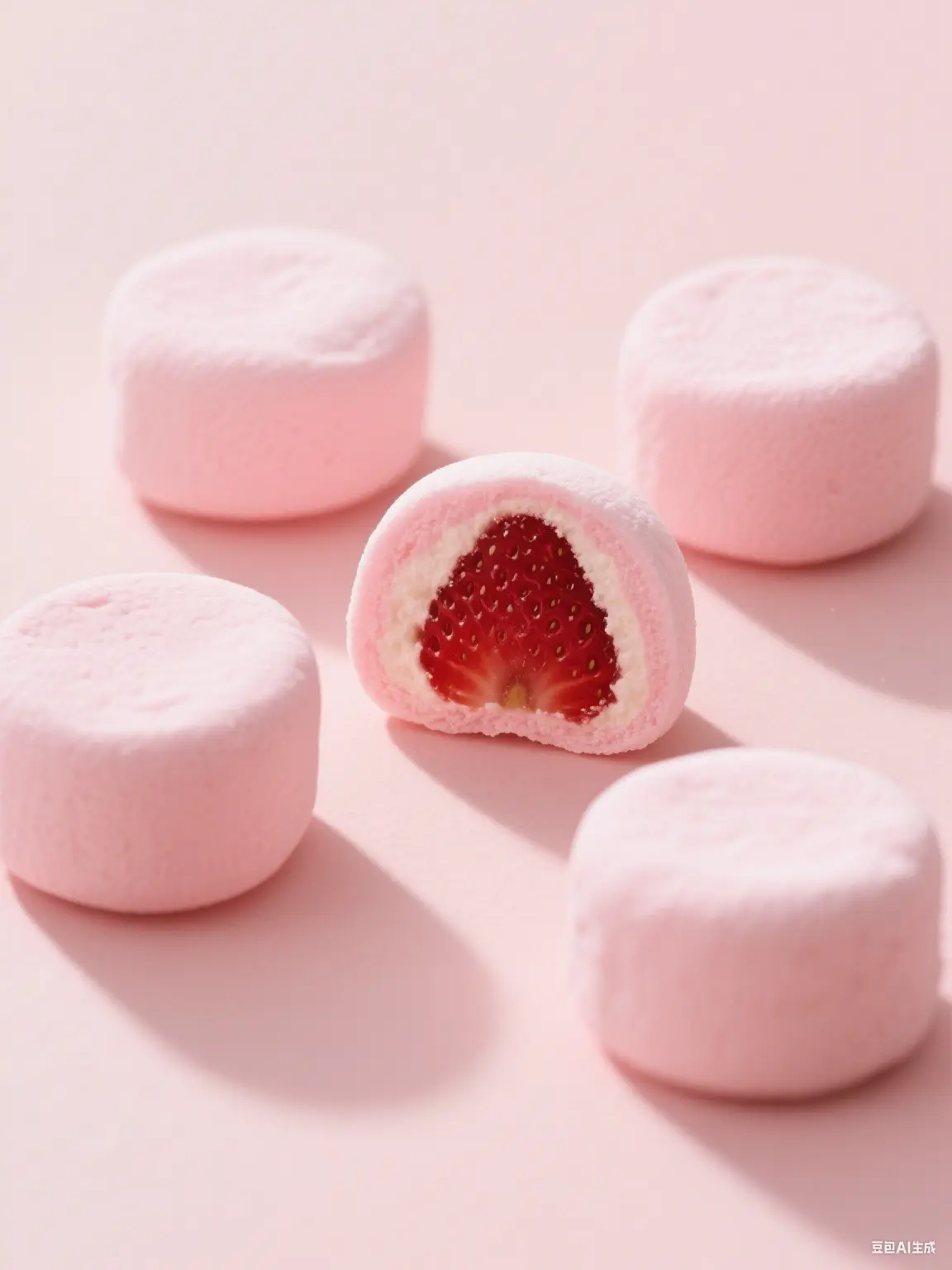 蓬鬆柔軟的棉花糖包裹著酸甜可口的草莓乾,輕輕咬下,先是棉花糖的甜蜜柔軟,接著是草莓乾的清新酸爽,兩種滋味在口中交織,帶來獨特的美味體驗。